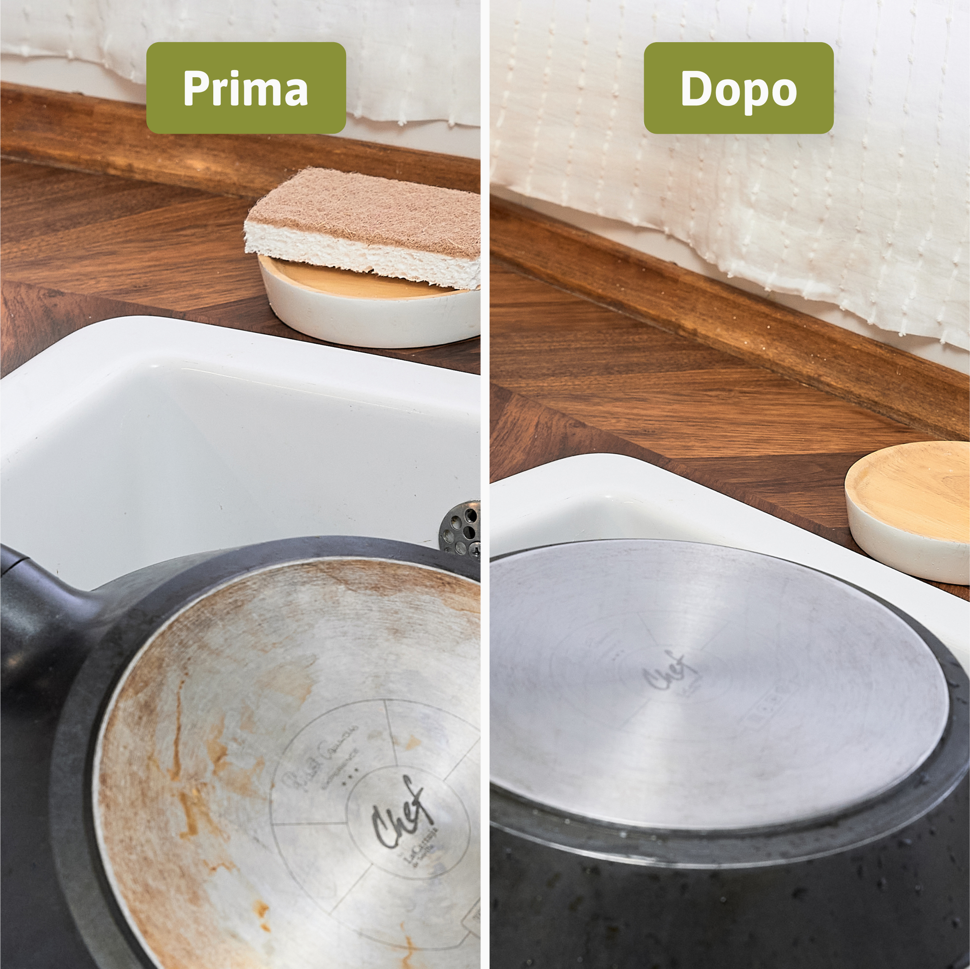 Bagna con acqua calda il fondo della padella. Inumidisci la superficie con acqua calda, poi coprila con l'Acido Citrico. Lascia agire 5 minuti. Strofinala bene con una spugna o una spazzola. Fatto!