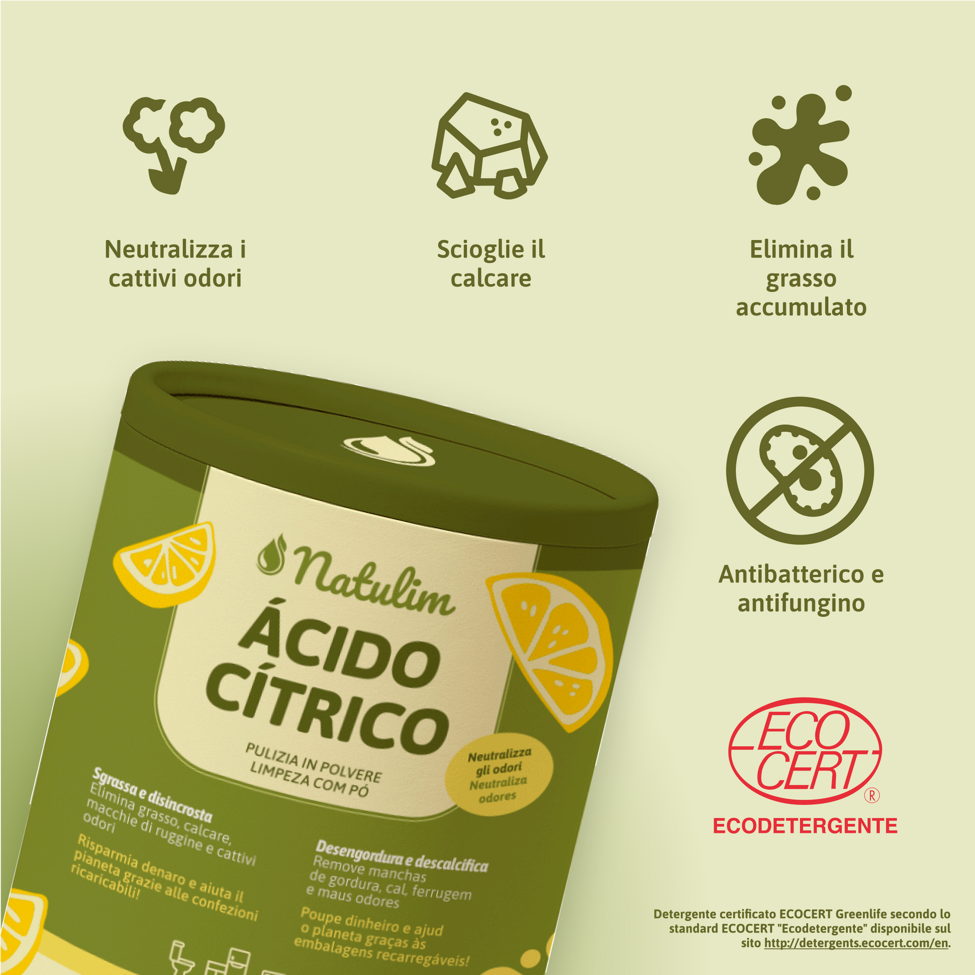 L'acido citrico si distingue per le sue proprietà antibatteriche e antifungine naturali. È un prodotto versatile ed efficace che affronta diversi tipi di pulizia domestica. Il suo potere igienizzante e antibatterico lo rende fondamentale per la pulizia profonda, eliminando germi e batteri in modo naturale.