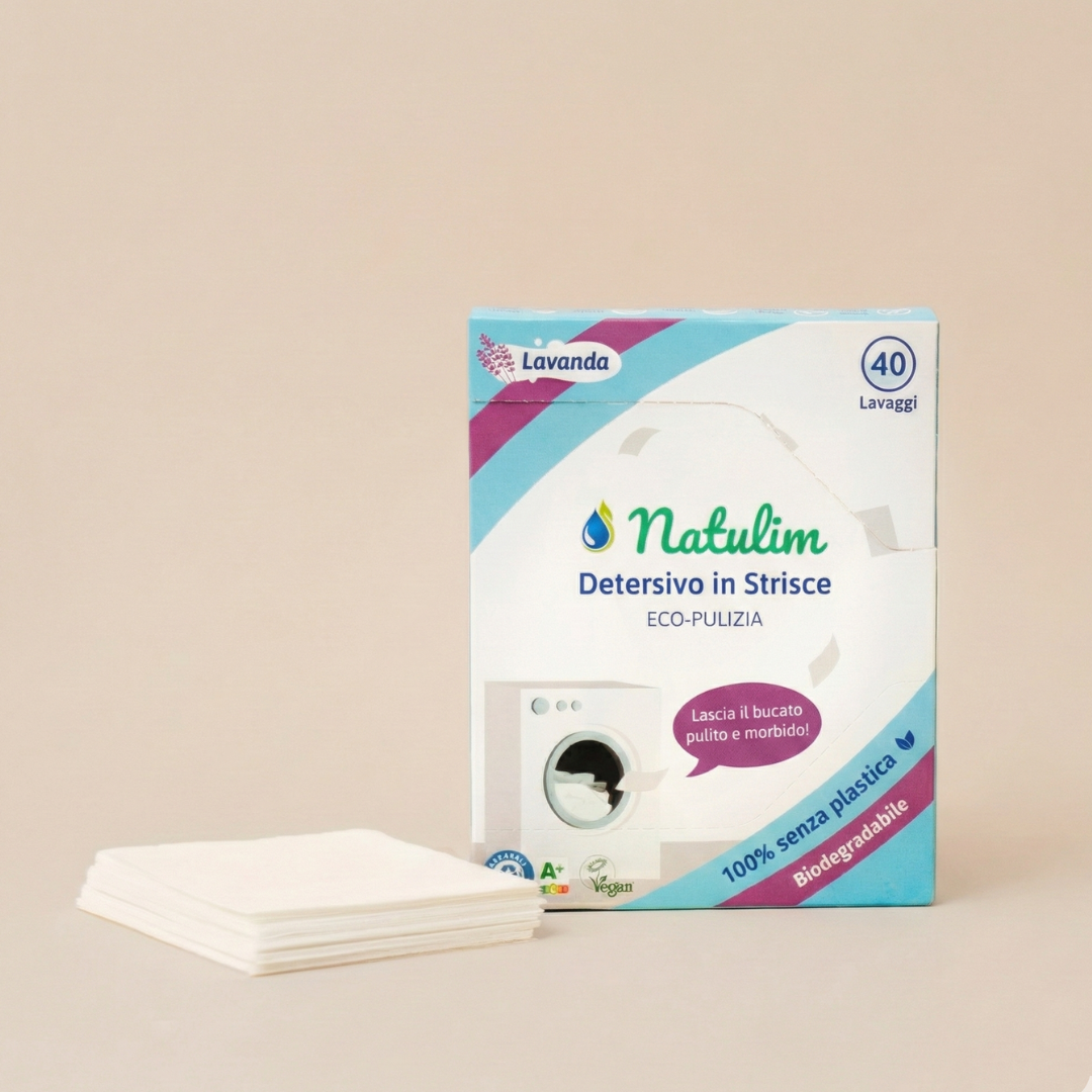 Basta trasportare bottiglie d'acqua mascherate da detersivo. Ogni fogliolino pesa pochi grammi, sta in un cassetto e lava un carico intero. Pratico, leggero, zero plastica.