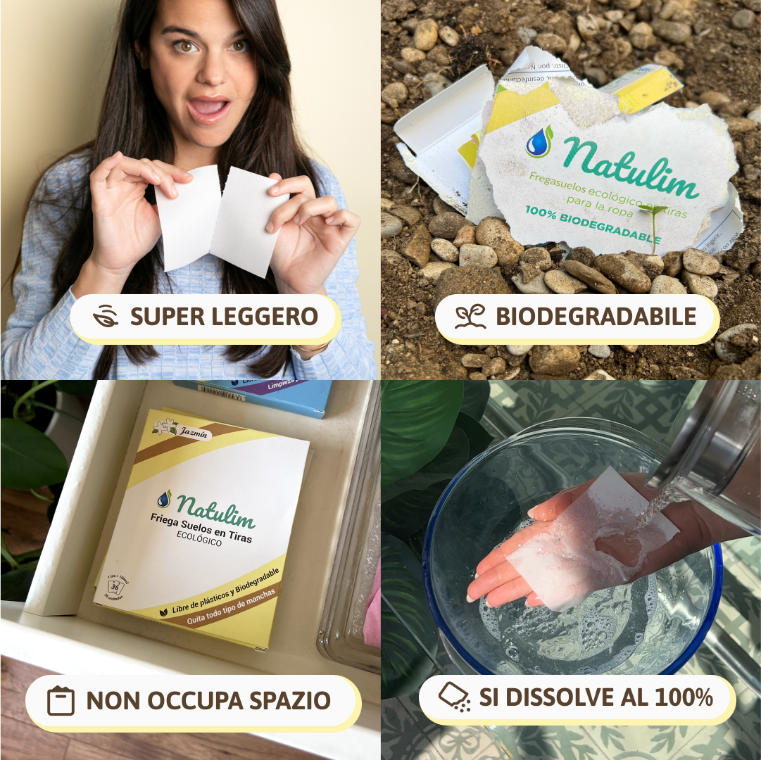 Confezione in cartone biodegradabile. 30 fogli = 30 lavaggi. Non serve dosare.