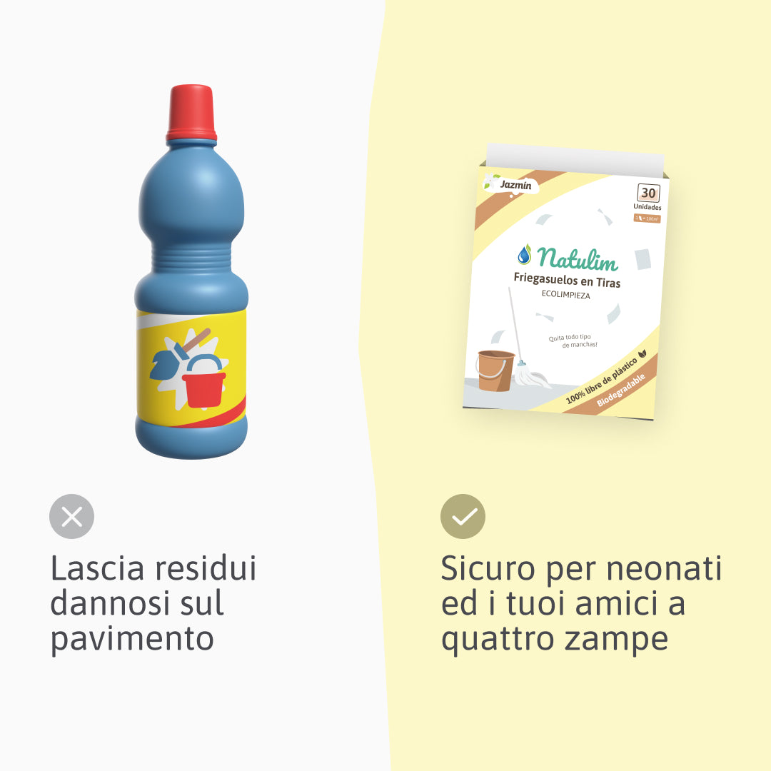 Pulisce a fondo senza candeggina o ammoniaca. Adatto a legno, marmo, gres, laminato. Sicuro per animali domestici.