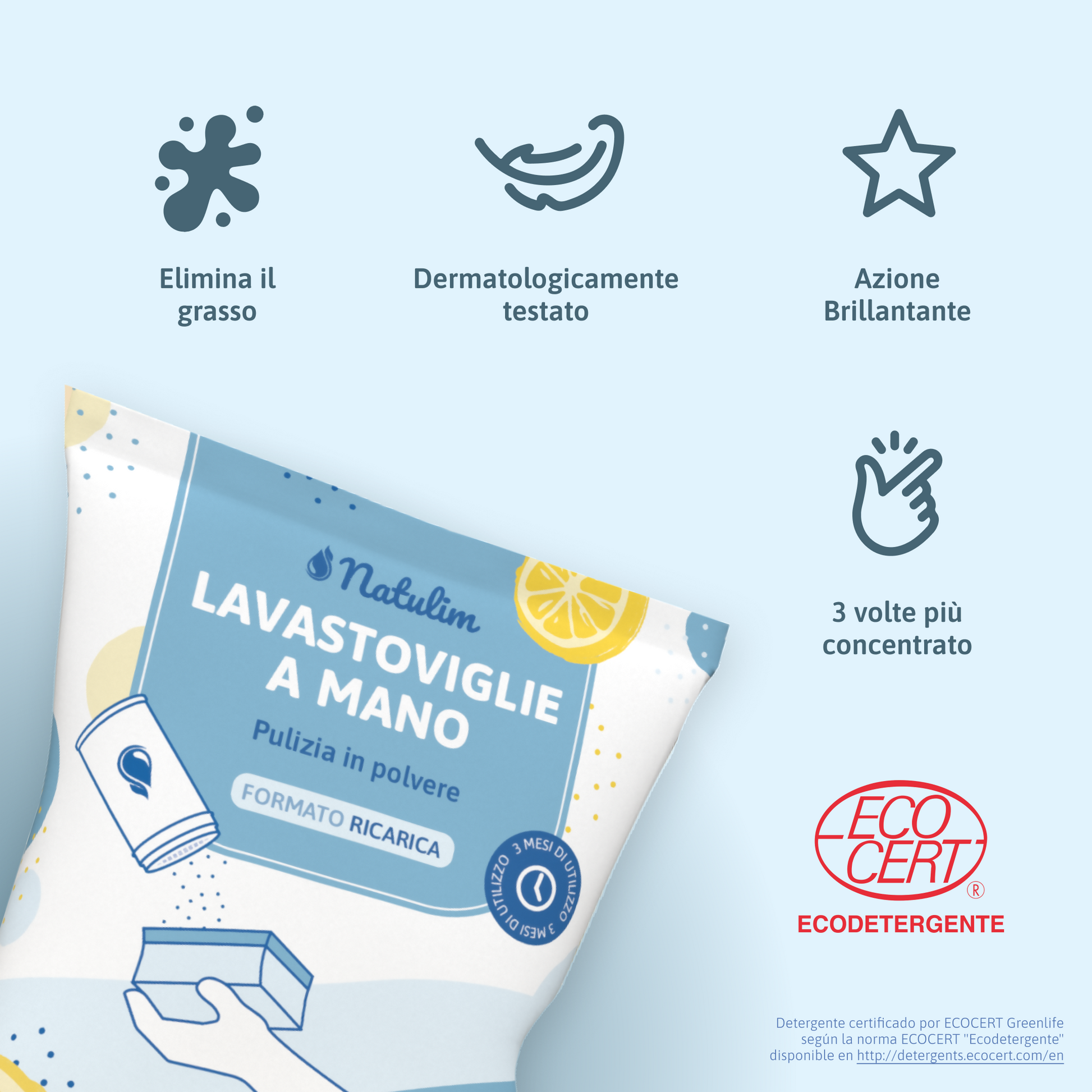 Il detersivo per piatti a mano Natulim è altamente concentrato. Una volta diluito nella dose indicata, diventa un prodotto rispettoso dell'ambiente che non produce effetti nocivi sugli organismi viventi né a breve né a lungo termine. La sua composizione è costituita per il 94,4% da ingredienti di origine naturale.