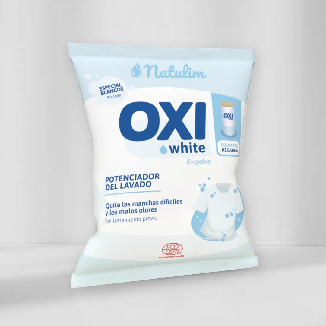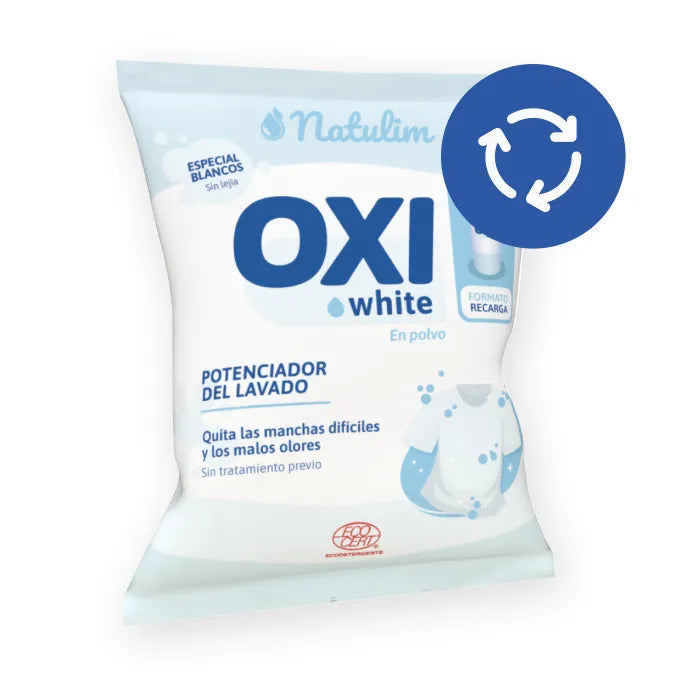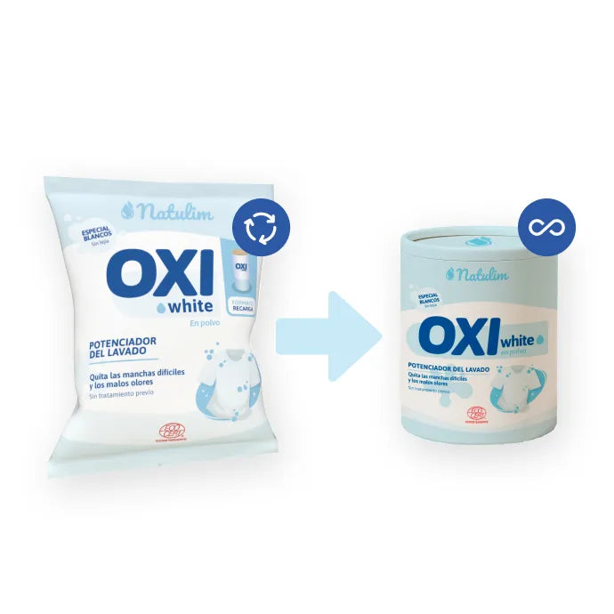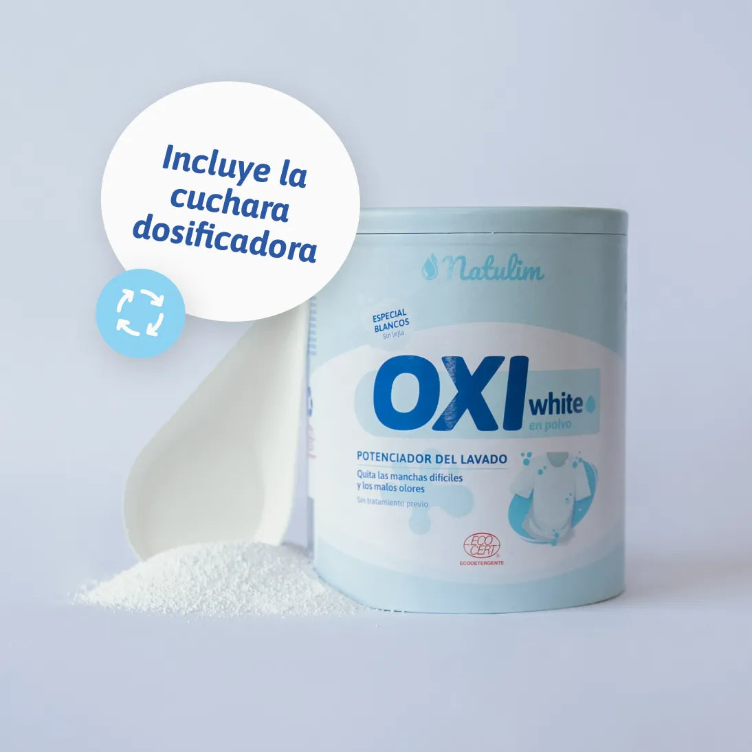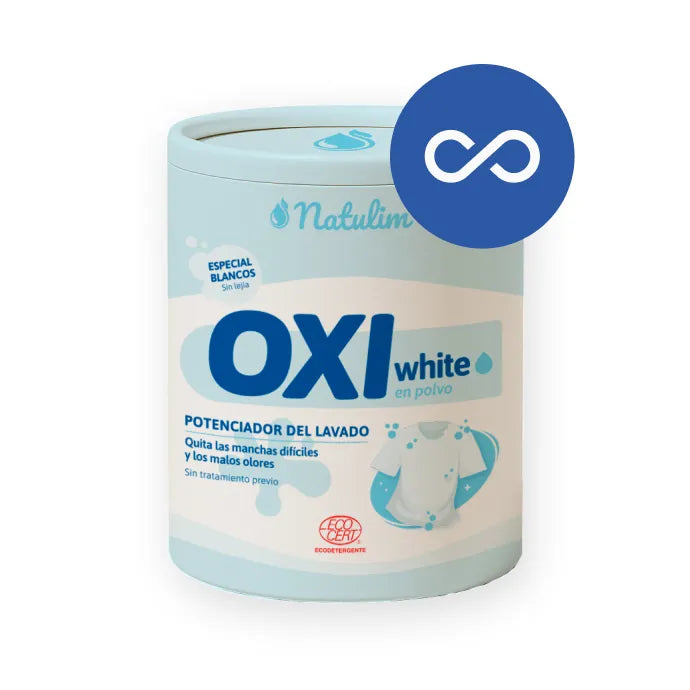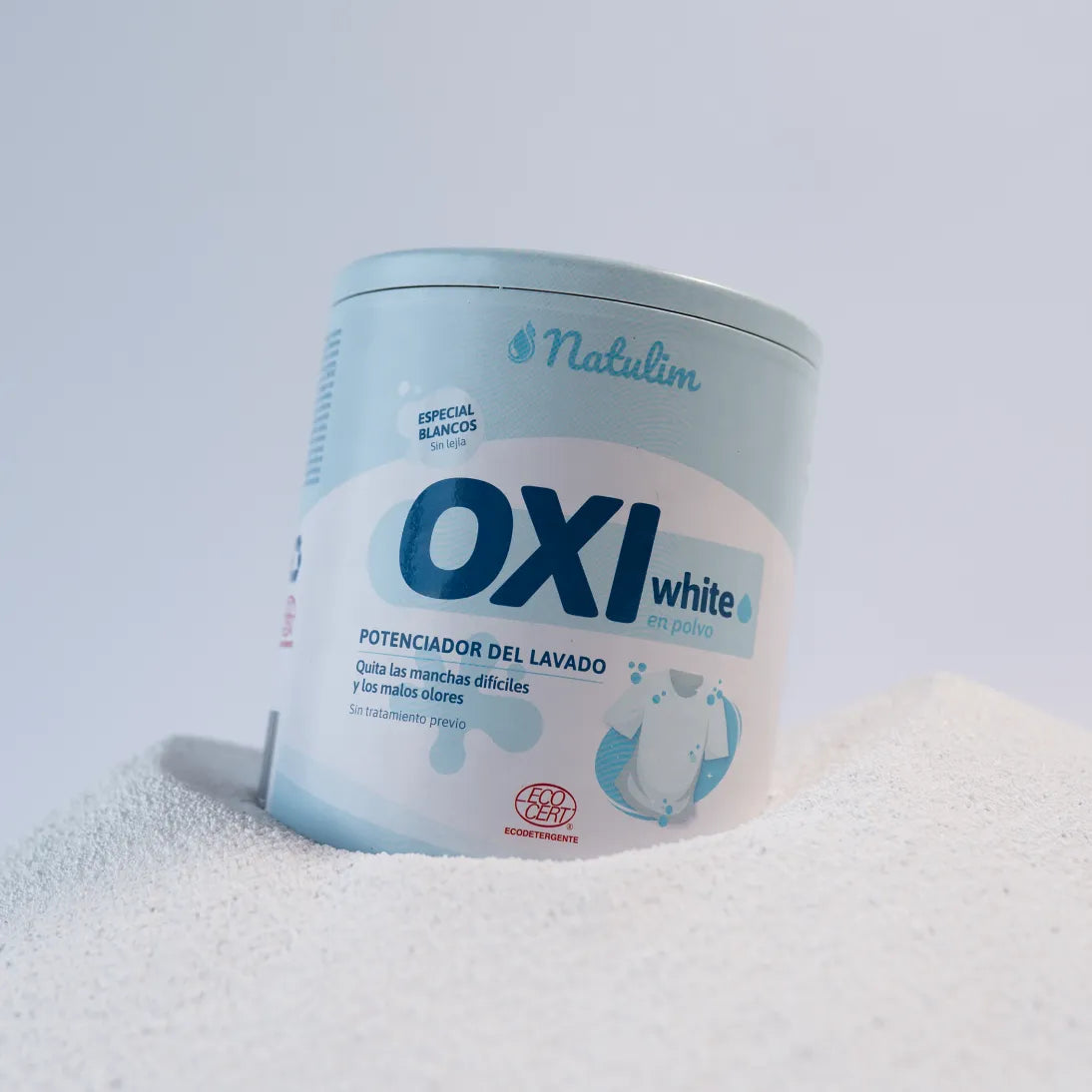 È un additivo per il bucato. Polvere in barattolo di cartone a base di ossigeno attivo (percarbonato di sodio). Combinare Oxi con il detersivo Natulim o tradizionale potenzia al massimo il risultato del lavaggio senza lasciare residui o sostanze tossiche.