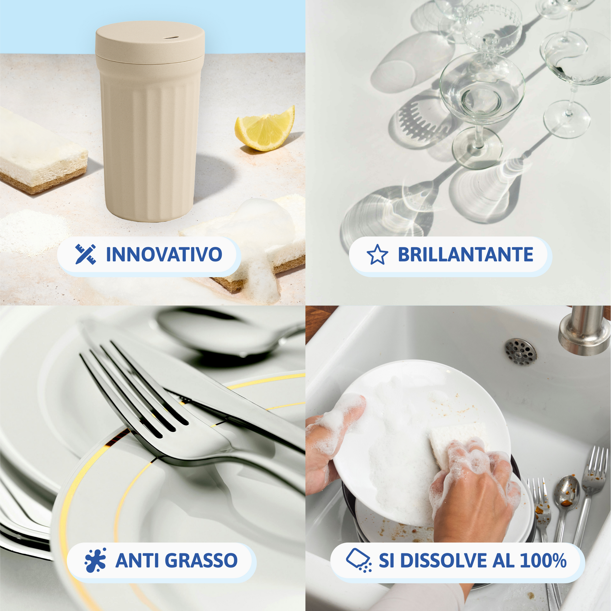 Sapone per piatti in innovativo formato polvere. Basta una piccola quantità sulla spugna per creare schiuma abbondante e duratura che elimina sporco e grasso da stoviglie, pentole, padelle. Formula eco-friendly con 94,4% di ingredienti naturali.