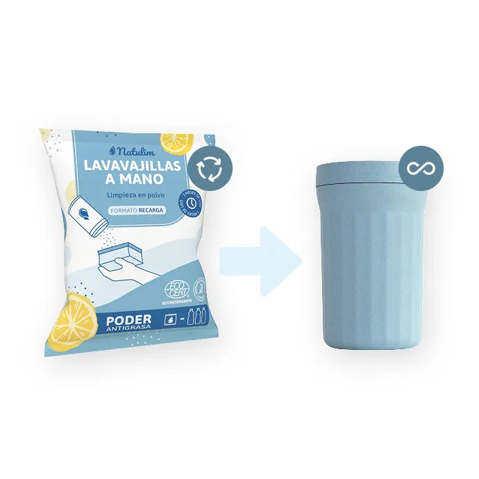 Contenitore realizzato al 60% con bucce di riso del Delta dell'Ebro. Coperchio con fori dosatori per evitare sprechi. Riutilizzabile: acquista solo la ricarica quando finisce.