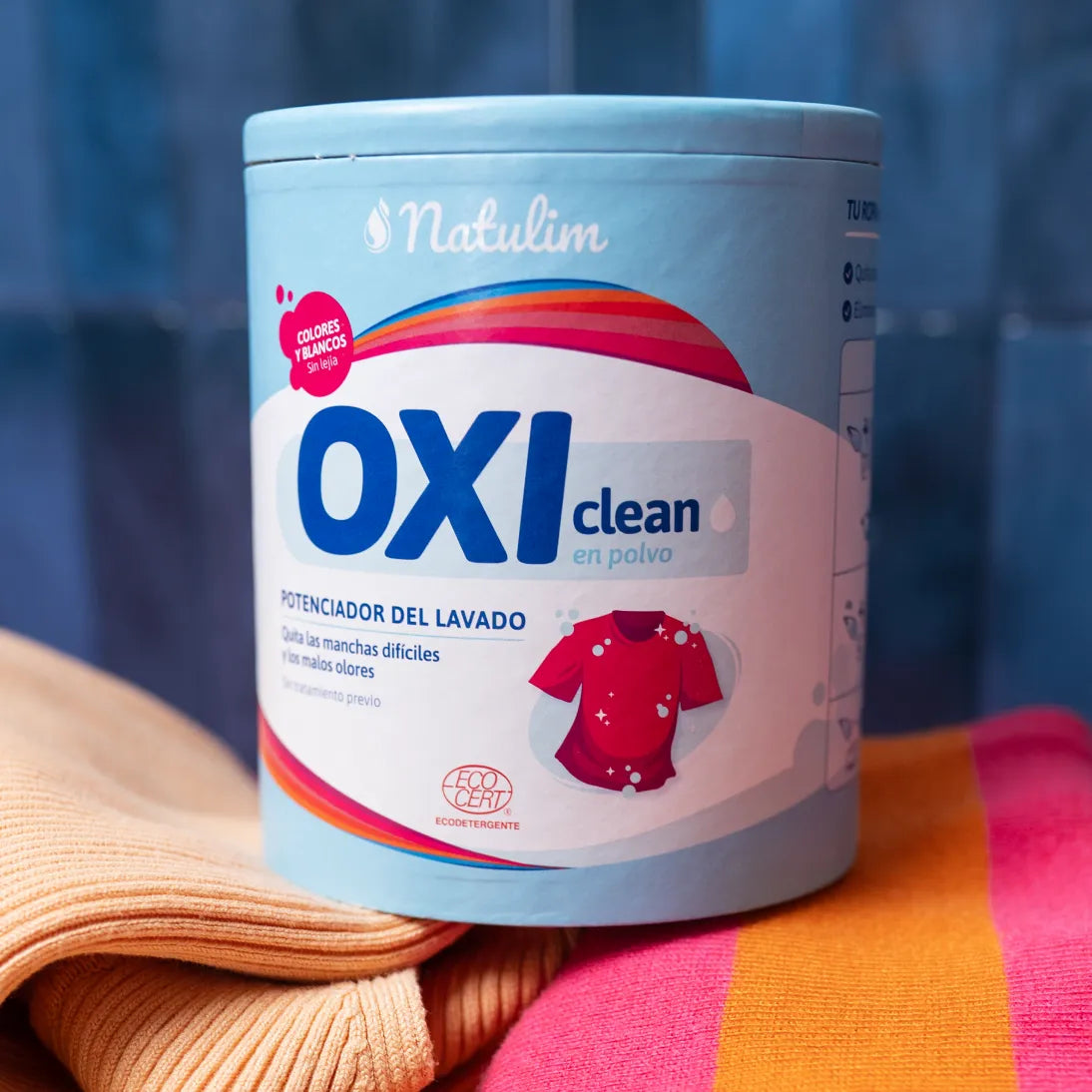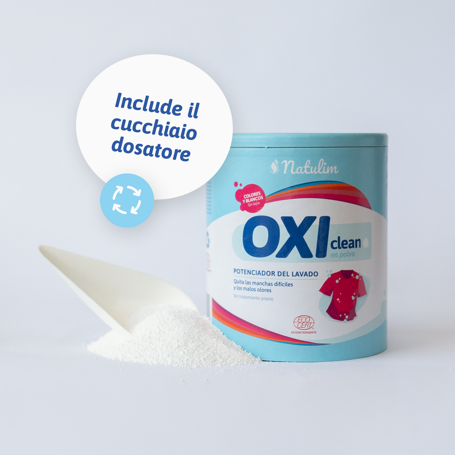 È un potenziatore per il bucato. Polvere in barattolo di cartone a base di ossigeno attivo (percarbonato di sodio). Combinare Oxi con il detersivo Natulim o tradizionale potenzia al massimo il risultato del lavaggio senza lasciare residui o sostanze tossiche.
